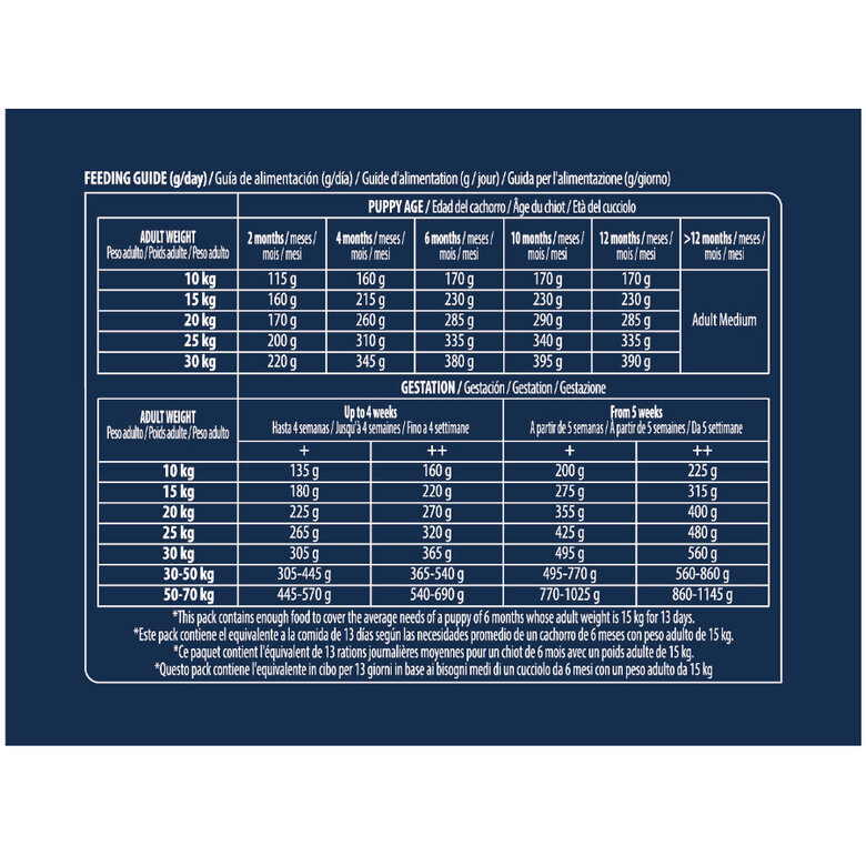 Indicado para cachorros de razas medianas que alcanzarán entre 10 y 30 kg en la edad adulta. Ajustar la ración diaria según edad, peso y nivel de actividad.