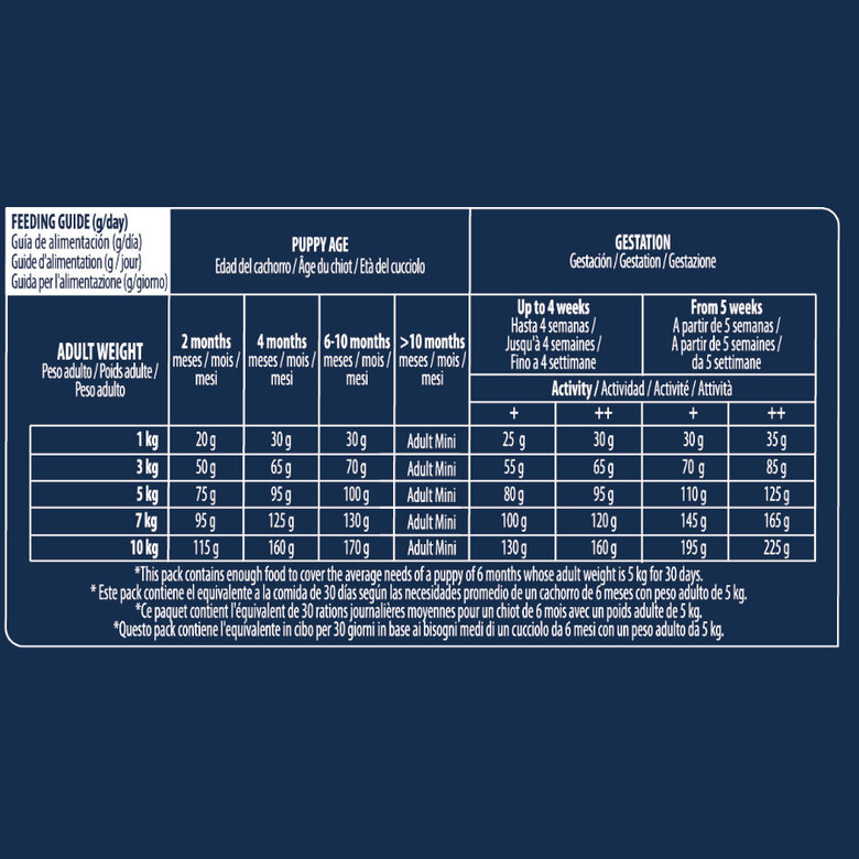 Para facilitar la adaptación al pienso, se aconseja humedecer ligeramente las croquetas durante los primeros días. La ración diaria debe ajustarse según la edad, peso y estado de salud del cachorro.