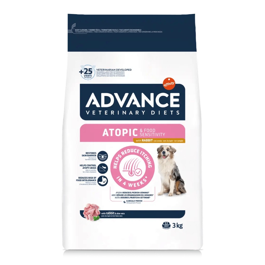 Advance Veterinary Diets Atopic Conejo & Guisantes es un alimento dietético completo y equilibrado para perros adultos, formulado para cuidar la piel y el pelaje en casos de dermatitis o pérdida excesiva de pelo, así como para reducir las intolerancias alimentarias a ingredientes o nutrientes.