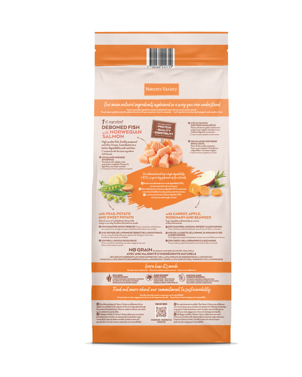 Esta receta sin cereales combina proteínas de alto valor biológico con una cuidada selección de frutas y verduras, favoreciendo una digestión óptima, una correcta condición física y el bienestar general del perro. El salmón, además de ser altamente digestible, aporta ácidos grasos esenciales que contribuyen a una piel sana y un pelaje brillante.