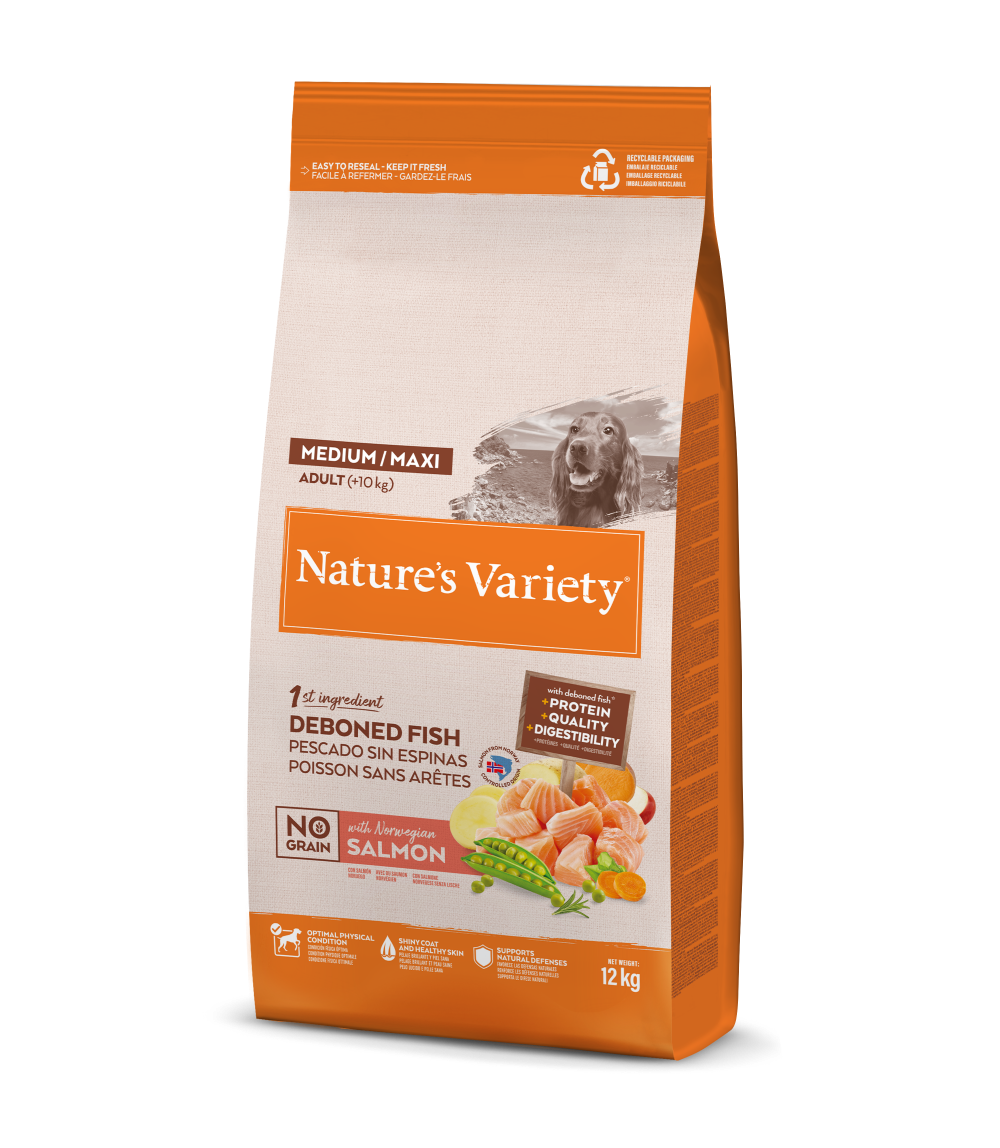 Pienso natural sin gluten con salmón para perros adultos de raza mediana. Elaborado con carne de salmón sin espinas de la más alta calidad como ingrediente principal, ofrece una nutrición completa y equilibrada adaptada a las necesidades de los perros en su etapa adulta.