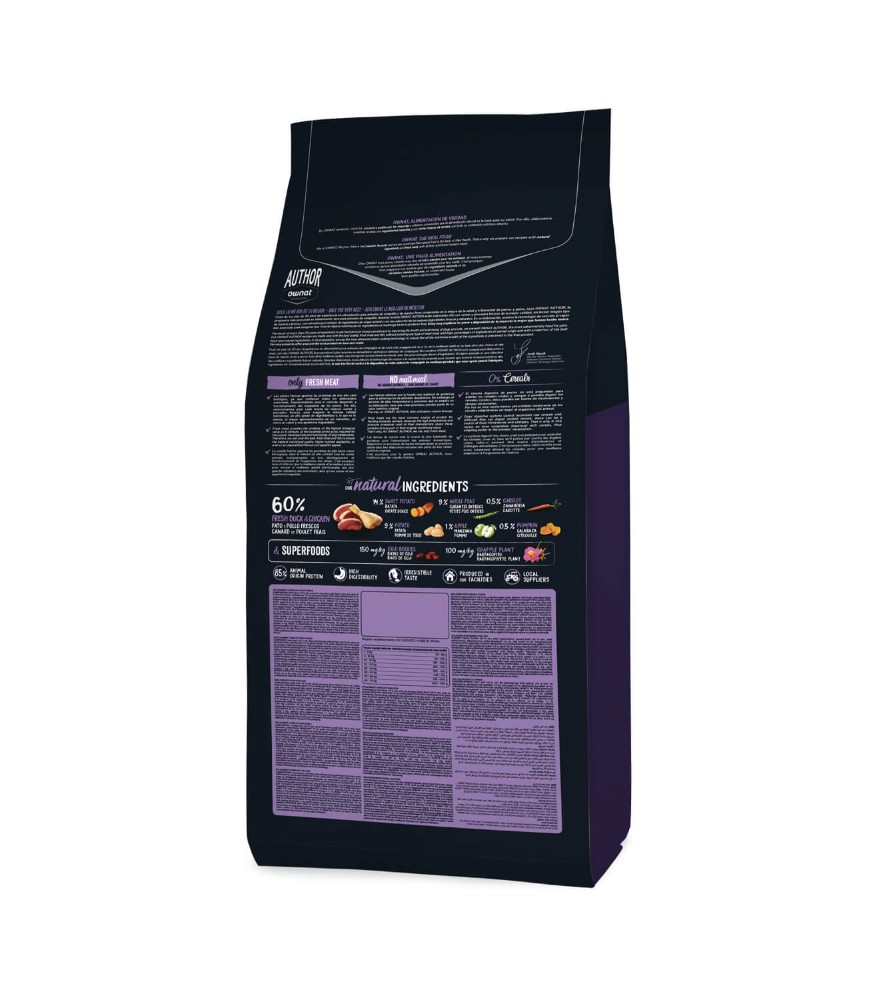 Si buscas un alimento seco sabroso, saludable y de máxima calidad para tu perro adulto, este pienso elaborado con pato y pollo frescos es la elección ideal. Su fórmula grain free (sin cereales) y sin conservantes ni colorantes artificiales garantiza una nutrición equilibrada, natural y respetuosa con su organismo.